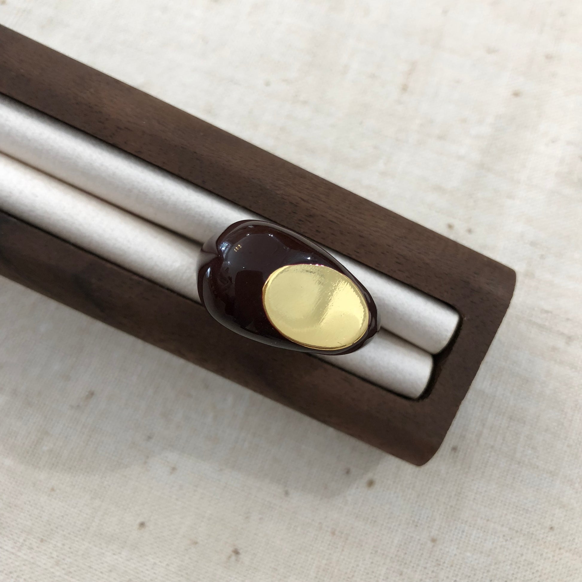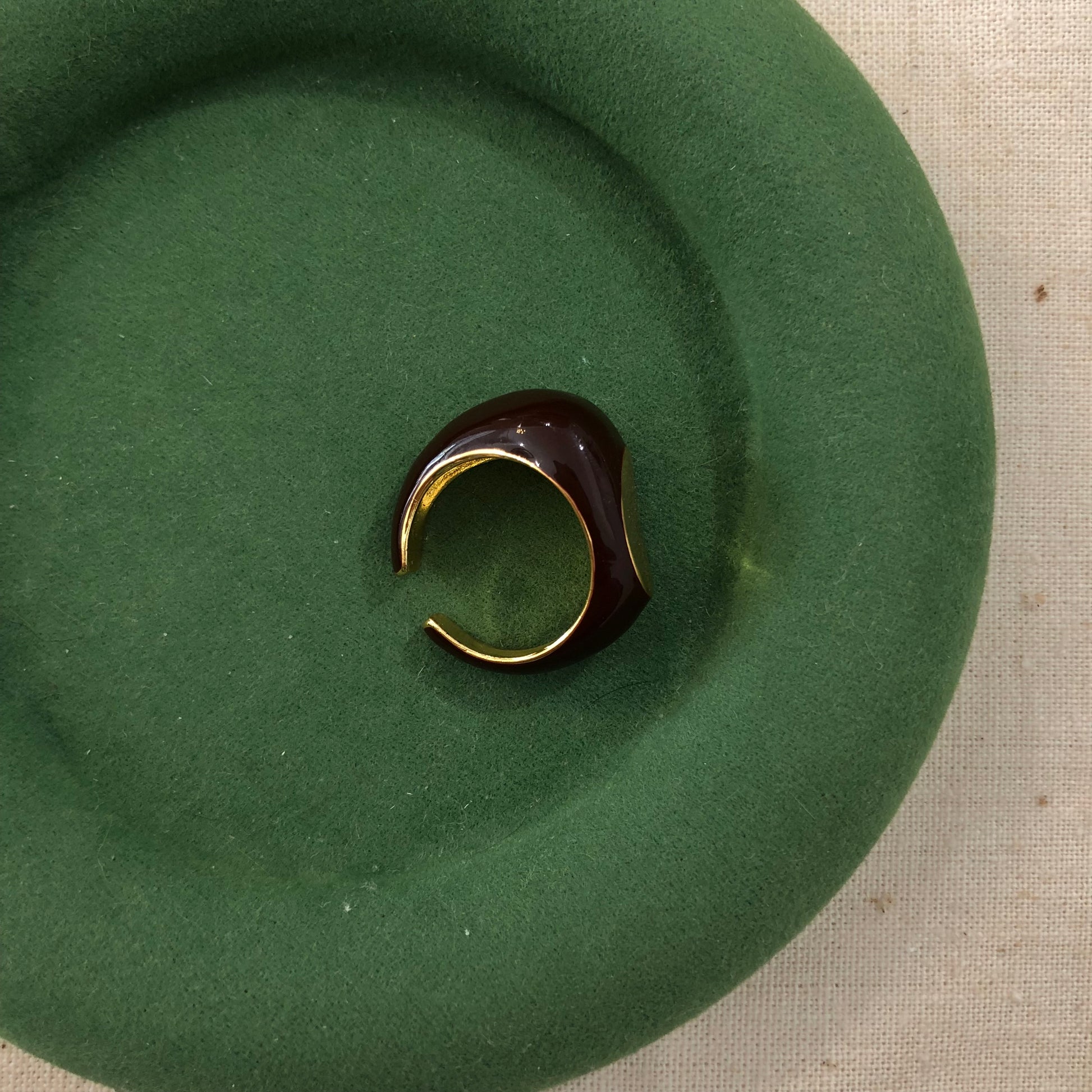 Inspired by the deep tones of Bordeaux wine, this ring features a rich burgundy enamel finish wrapped around a softly sculpted dome silhouette. The glossy surface contrasts beautifully with the warm gold-toned interior, creating a bold yet refined statement piece. Elegant enough for everyday wear, yet distinctive enough to stand out.